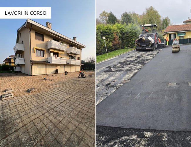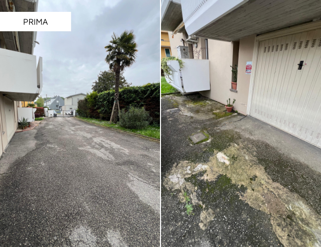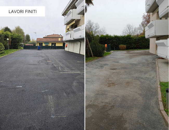 Realizzazione di un nuovo piazzale esterno condominiale destinato a parcheggio e area di manovra. Abbiamo demolito il vecchio cemento e realizzato un nuovo piazzale, con sistemazione del sottofondo e getto del nuovo calcestruzzo con le pendenze previste.